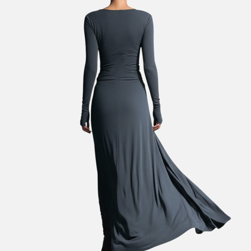 Robe maxi élégante à la coupe fluide et enveloppante. Confectionnée dans une matière douce et extensible, elle épouse la silhouette avec finesse. Le nœud latéral souligne la taille et apporte du mouvement, pour une allure moderne, féminine et intemporelle, idéale pour les occasions élégantes.